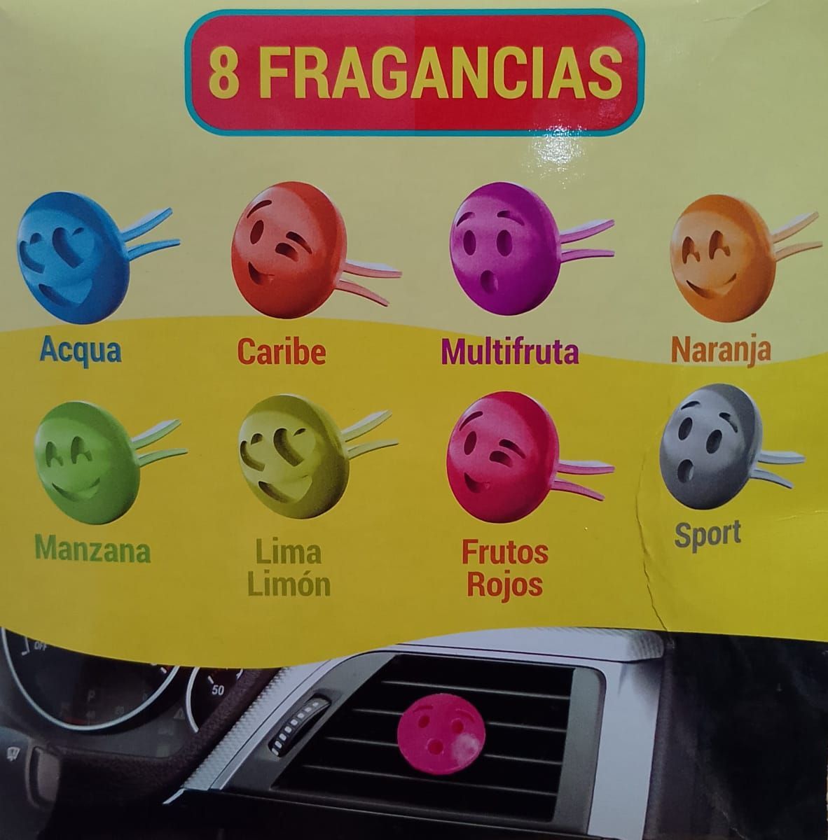 Aromatizante de auto disponible en 8 fragancias: aqua, Caribe, Multifruta, Naranja, Manzana, Lima Limón, Frutos Rojos y Sport.